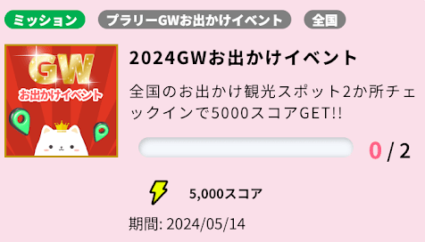 全国のお出かけ観光スポット2か所にチェックインすると5,000スコアもらえる